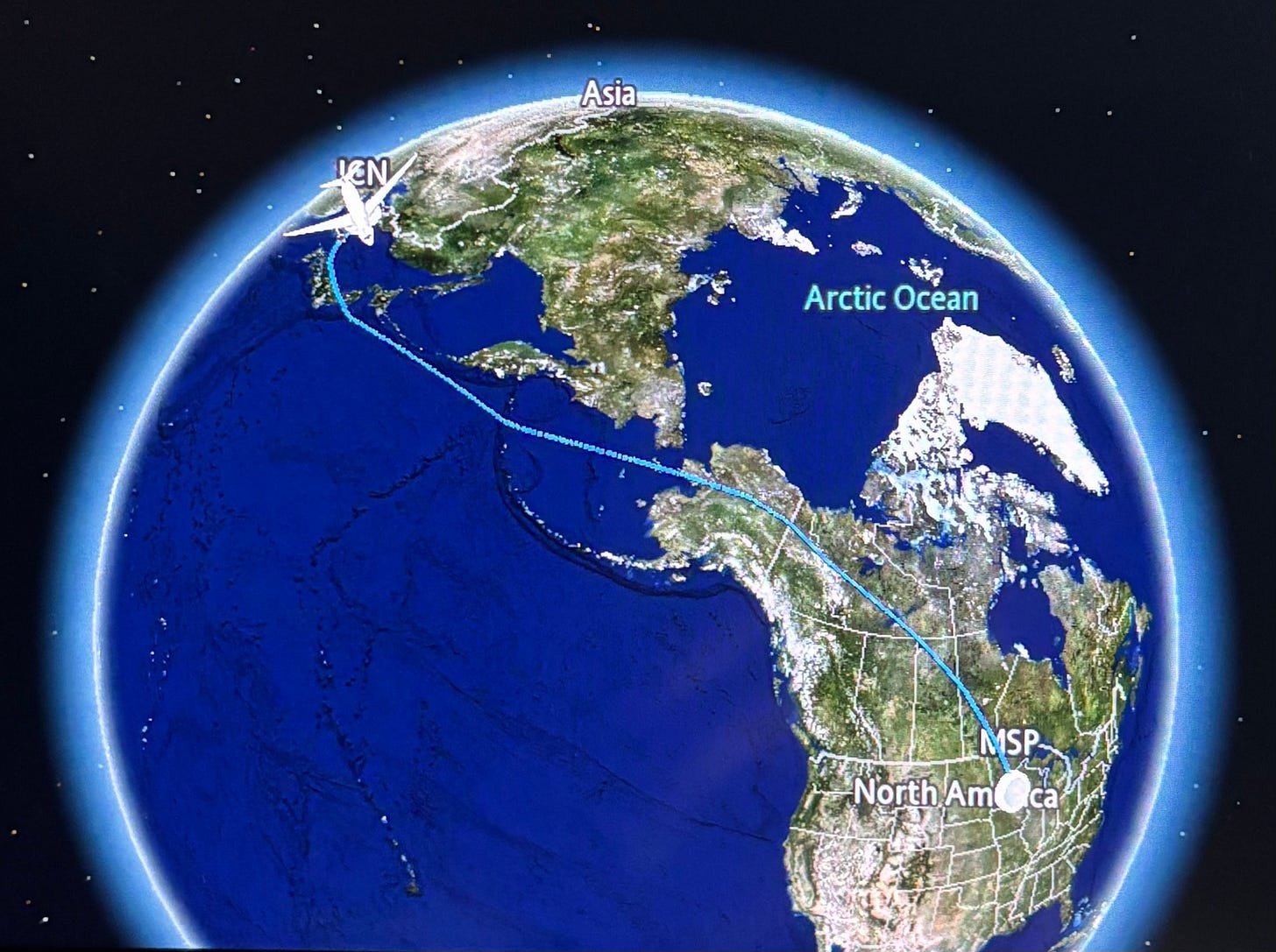They rerouted us to Minneapolis so that we’d arrive with a 2 hour layover in South Korea instead of 50 minutes. The longest part of our trek was between Minneapolis and South Korea.