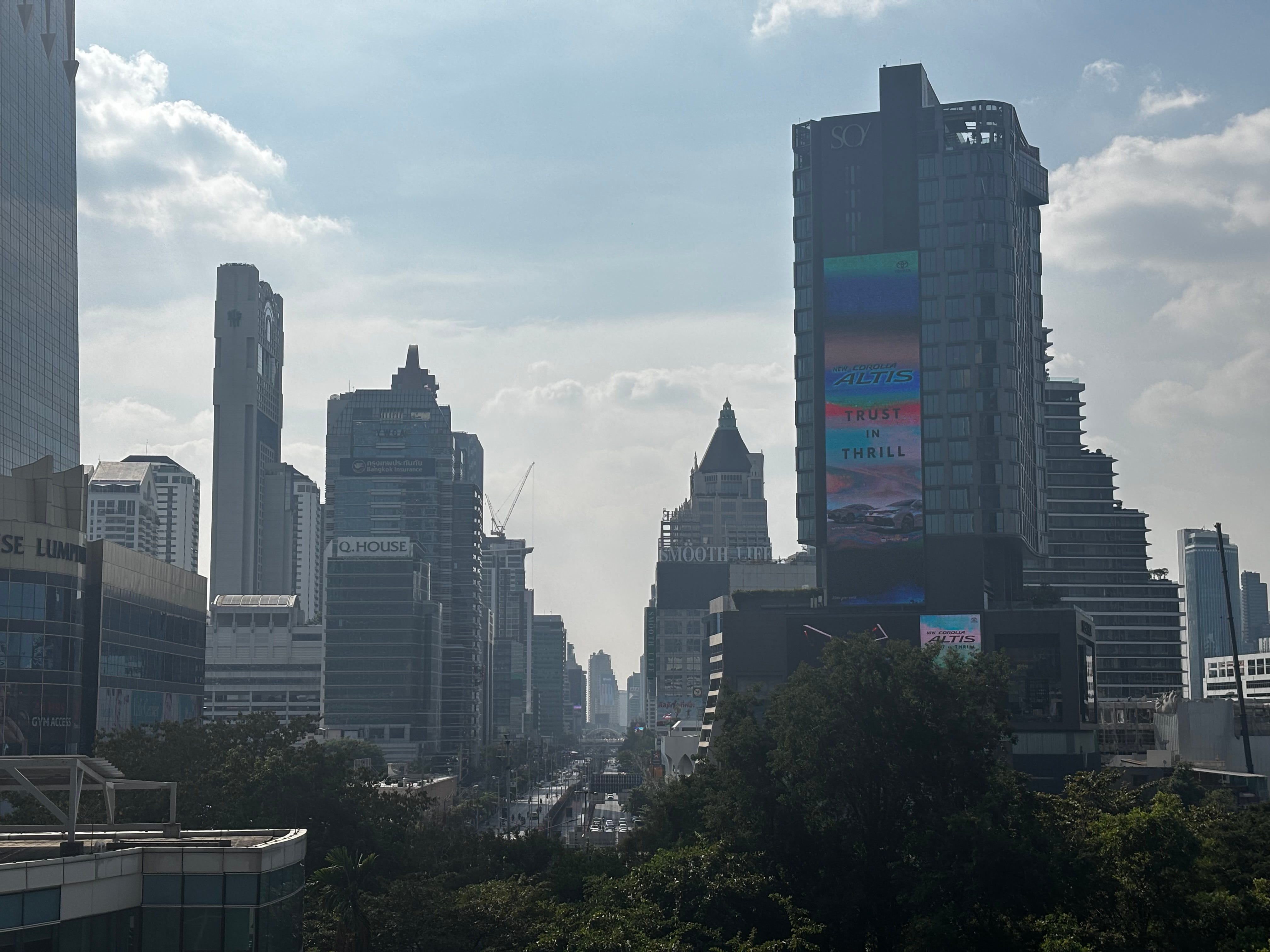 We exit the boisterous airport and slide into the van our hotel had scheduled to pick us up. After 26 hours of airports and flights, arriving at Gecko Eye Hotel was the best feeling ever. It was so peaceful, despite being in the midst of downtown activity on a Saturday night. I didn’t realize how central the hotel was on the map, nor how happening Bangkok is. We opened the door to our room and there was more space than expected, with an entire wall of ceiling to floor windows that overlooked the BTS Skytrain and EmSphere Mall, couches facing a smart TV, and a coffee table in the center of the living space. “This is quite the first impression,” I thought to myself as I kicked off my shoes and dropped the heavy backpack.